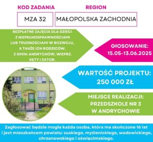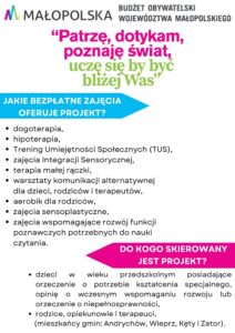 Grupa pracowników złożyła jesienią 2024 roku projekt wart 250 000 zł w ramach 8 Edycji Budżetu Obywatelskiego Województwa Małopolskiego o nazwie: „Patrzę, dotykam poznaję świat, uczę się by być bliżej Was”, który będzie polegał na realizacji bezpłatnych zajęć dla dzieci