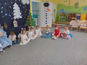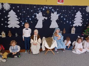 Dzieci pod czujnym okiem swoich Pań zaprezentowały wiersze, piosenki oraz tańce, które ćwiczyły na tą uroczystość. Zarówno Maluszki, jak i Starszaki zaprezentowały Jasełka.