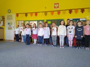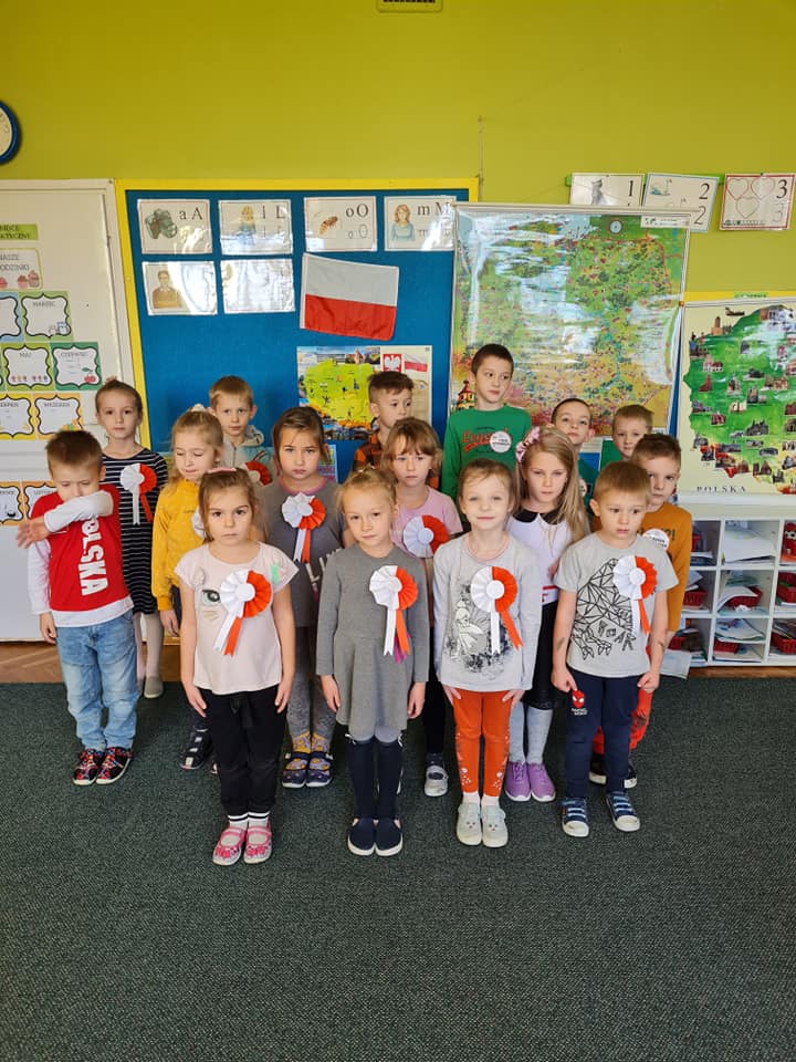 11-go listopada obchodziliśmy w naszym przedszkolu Święto Niepodległości. Z tej okazji dzieci wykonały na tę uroczystość kotyliony w kształcie kwiatka w barwach ojczystych i odśpiewały hymn Polski – „Mazurek Dąbrowskiego”. Dzięki udziałowi w tego typu uroczystościach przedszkolaki od najmłodszych lat uczą się patriotyzmu, kształtują pozytywne postawy i uczucia patriotyczne.