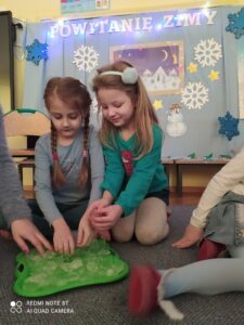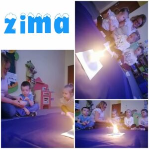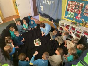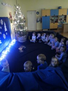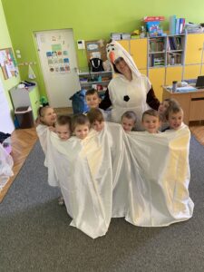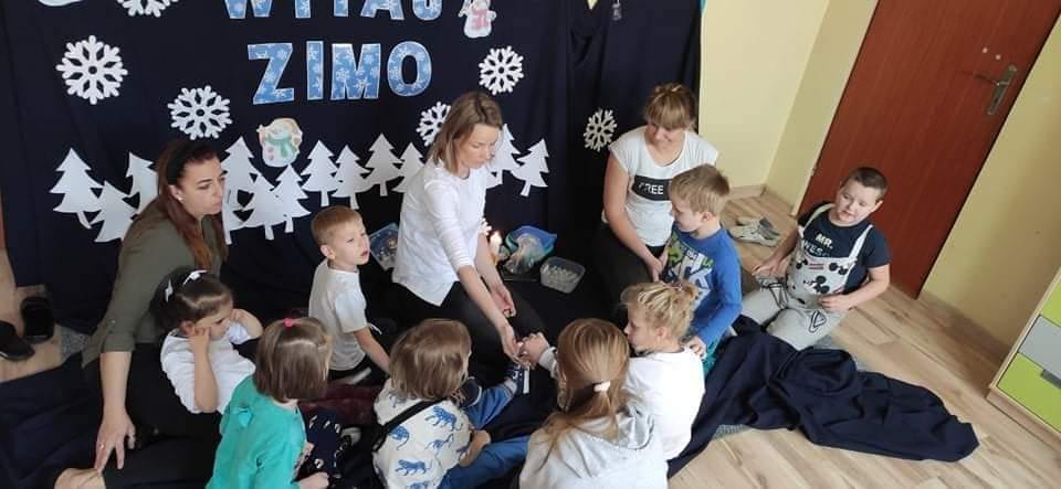 22-go grudnia zgodnie z tradycją w naszym przedszkolu odbyło się „Powitanie Zimy” metodą porannego kręgu, która aktywizując wszystkie zmysły: dotyk, wzrok, słuch, węch i smak, w sposób odmienny dla każdej pory roku, podkreśla zmiany zachodzące w przyrodzie. Dzieci ubrane na biało lub niebiesko poznały zapach mięty, skosztowały miętowej herbatki, bawiły się śniegiem oraz kostkami lodu, słuchały dźwięków dzwonków i grały na trójkątach. Przedszkolaki chętnie śpiewały i ilustrowały ruchem piosenki o tematyce zimowej. Utrwaliły wiadomości na temat białej pory roku słuchając wierszy, opowiadań i rozwiązując zagadki. Miały również okazję spotkać się z ,,Bałwanem Olafem”, który tego dnia odwiedził nasze przedszkole.