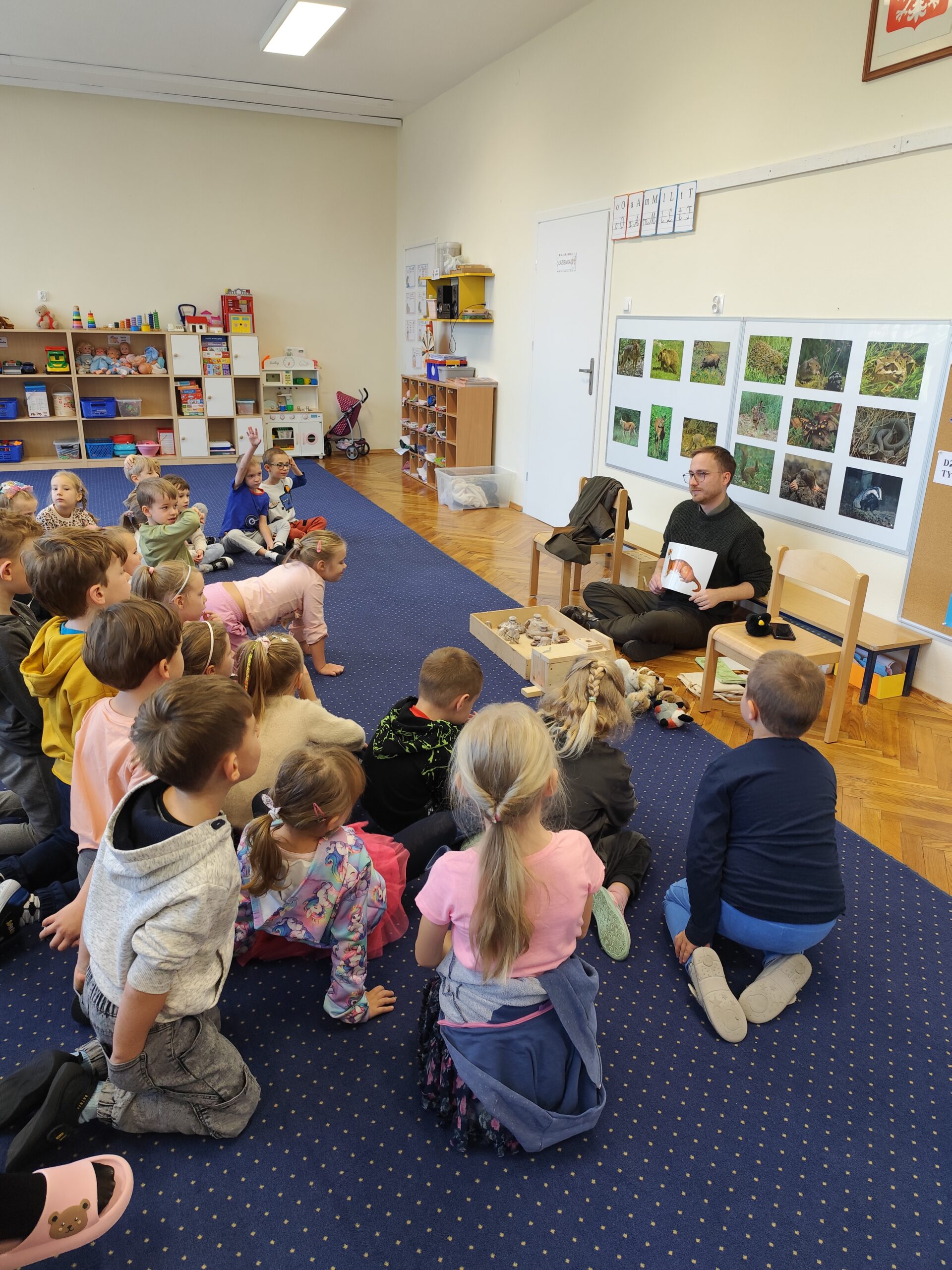 We wtorek 22 października dzieci wzięły udział w zajęciach edukacyjnych z Panem Leśniczym, który w bardzo ciekawy sposób opowiedział im o swojej pracy. W oparciu o przyniesione ilustracje, eksponaty zapoznał dzieci z mieszkańcami naszych lasów, opowiedział o ich zwyczajach, środowisku w jakim żyją oraz o sposobie zimowania. Opowiedział także, o tym, jak można pomóc zwierzętom przetrwać zimę. Na zakończenie zajęć dzieci wręczyły leśniczemu dyplom oraz przekazały kasztany i żołędzie, które dzielnie zbierały od kilku tygodni.