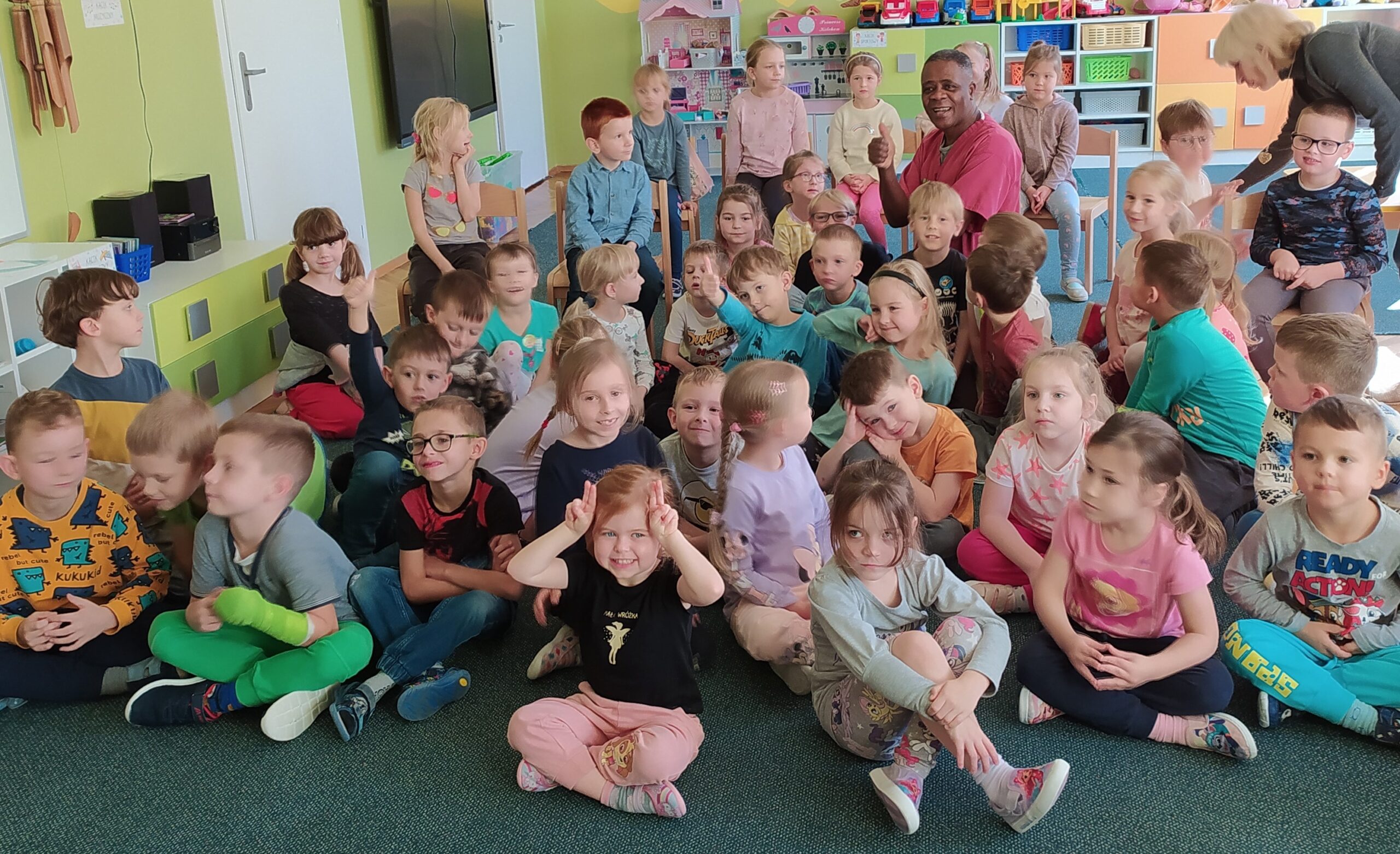 17.10. dzieci z grupy III, IV i V odwiedził wyjątkowy gość – Pan doktor weterynarii Isaac Bada. Celem jego wizyty było wzbogacenie wiedzy dzieci z zakresu pracy weterynarza oraz kształtowanie pozytywnych postaw w stosunku do zwierząt. Pan doktor opowiedział dzieciom na czym polega jego zawód, zaprezentował również narzędzia, których używa w codziennej pracy. Spotkanie pozwoliło przedszkolakom poznać jak ciekawy i jednocześnie odpowiedzialny jest to zawód.