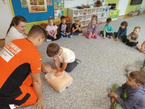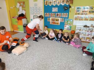 Podczas spotkania dzieci miały okazję poznać tajniki pracy ratownika medycznego oraz dowiedzieć się, jak udzielać pomocy w nagłych sytuacjach. Przedszkolaki z dużym zainteresowaniem słuchały opowieści o tym, jak ważne jest szybkie reagowanie i wzywanie pomocy.