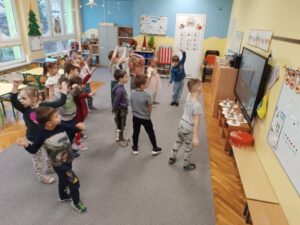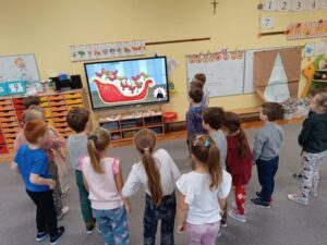 Nasze przedszkole uczestniczyło online na żywo w spotkaniu Integracyjnym: WF- Świąteczna Misja. Każda grupa wykonywała ćwiczenia pomagając tym samym elfom w ratowaniu Świąt Bożego Narodzenia. Spotkanie prowadziła paraolimpijka Katarzyna Kozikowska. Dzieci były bardzo zaangażowane w wykonywanie zadań.